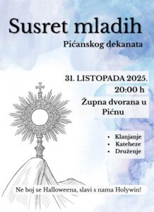 U petak 31.10. u 20:00 sati u Pićnu održat će se susret mladih pred svetkovinu Svih Svetih. Program se sastoji od upoznavanja, duhovnosti te druženja uz zakusku.